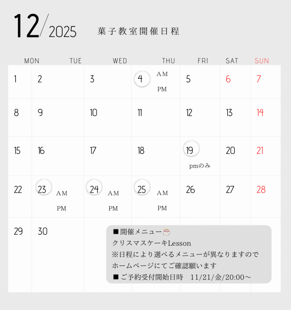 | お持ち物 | ■髪ゴム・シュシュなど (髪が結べる長さの方はまとめていただくようにお願い致します ◻︎エプロン、タオル、筆記用具は貸し出し有り(ご持参いただいてももちろんOKです) ⚠️⚠️⚠️ クリスマスケーキLessonにご参加の方は、お近くの方でも必ず、約25㎝角程度の箱が入る保冷バッグと、あれば保冷剤をご持参願います ※危険物のお持込はご遠慮ください (危険と判断した場合はご退出いただきます) |
